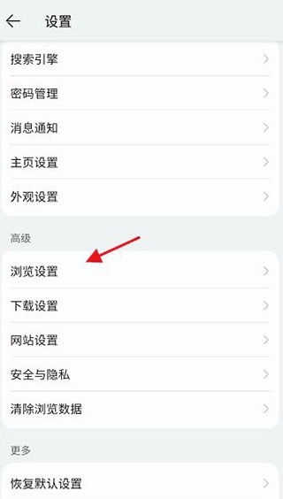 3、进入设置,找到下方的高级,点击浏览设置进入
