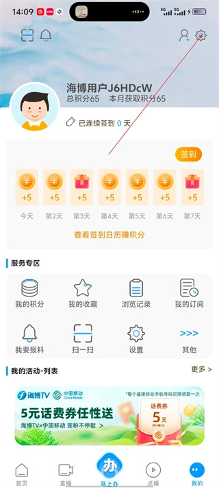 1、进入【海博TV】首页后,点击底部的【我的】按钮进入个人中心页面,在这里能够查看积分、签到以及服务专区等各类功能模块。