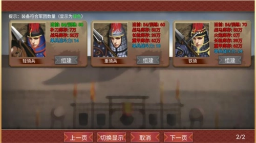 可以看到,在兵种选项中,绿色表示已满足条件,红色代表还未满足。军团的条件总共有两个,一个是训练度,一个是装备。