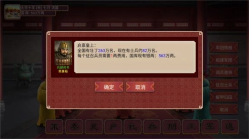 首先是训练度,要组建军团就要有壮丁,可以让兵部在全国范围内征召士兵。征召完士兵之后,点击加强训练可以进行练兵,每回合都有增长,速度比较慢。需要注意的是,每次征召士兵之后,都会导致训练度大幅下降,因此如果组建军团的需求比较迫切,切记要先等训练完成之后再重新征召士兵。