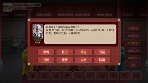 然后就是装备了,装备需要命令工部进行制造,每次只能生产一批装备,因此最好尽早开始做装备,每回合做一点。