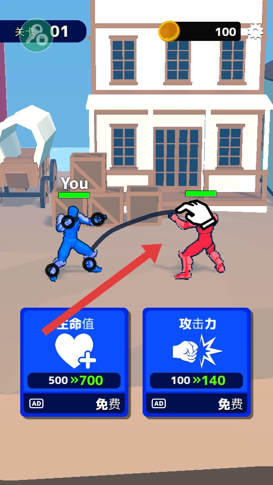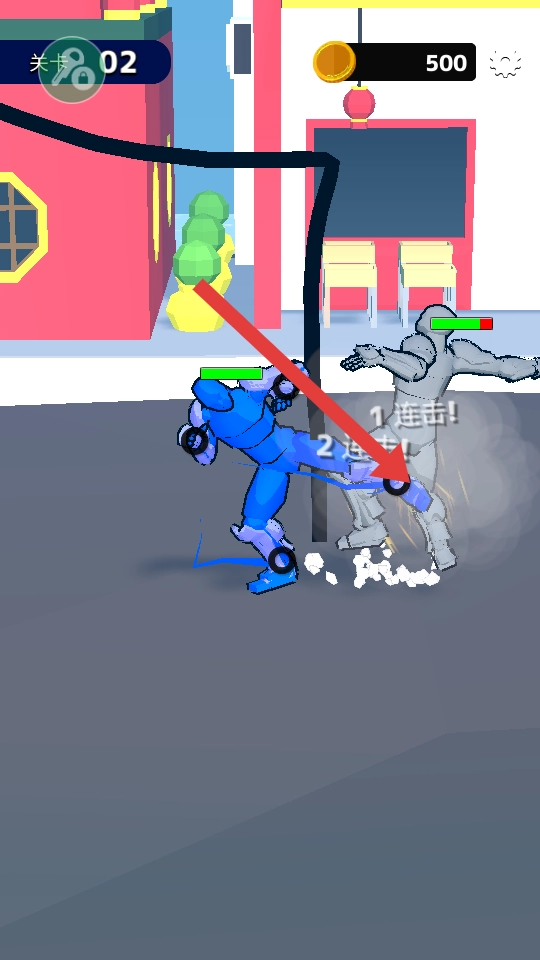 3、在第二关中,蓝色角色对灰色角色发起连击,连续攻击可触发额外伤害效果,迅速击败敌人,推进关卡进度。