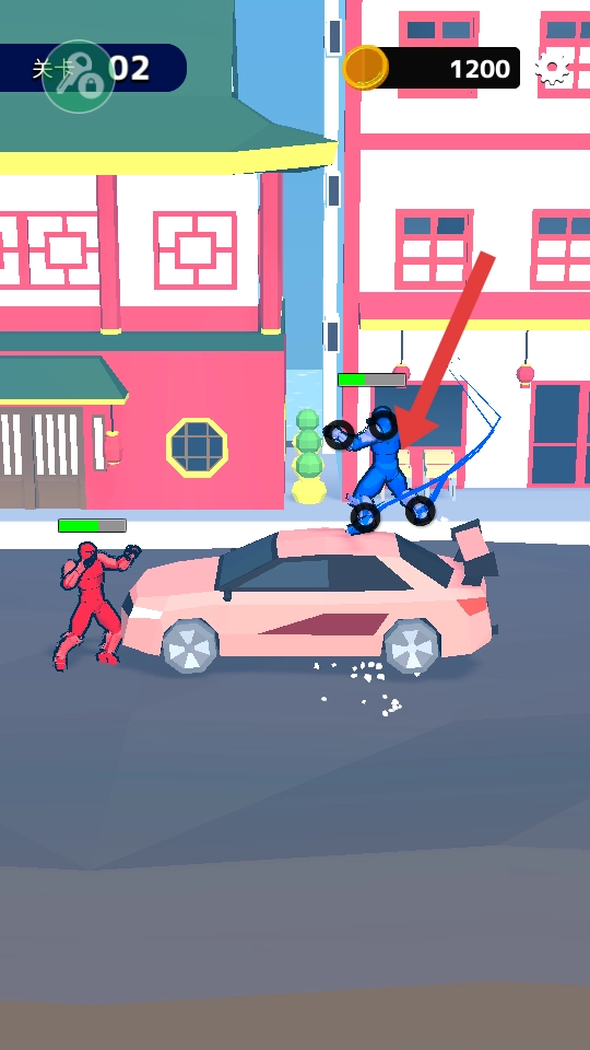 4、利用场景中的汽车作为攻击道具,蓝色角色跳上汽车攻击敌人,可对敌人造成范围伤害,同时躲避敌人攻击。