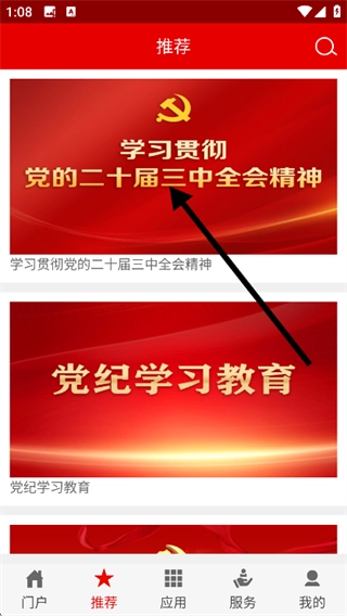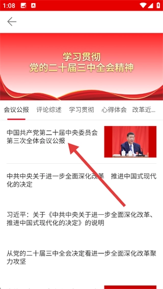 2、在推荐页面,点击【学习贯彻党的二十届三中全会精神】,即可进入关于党的二十届三中全会精神的内容。
