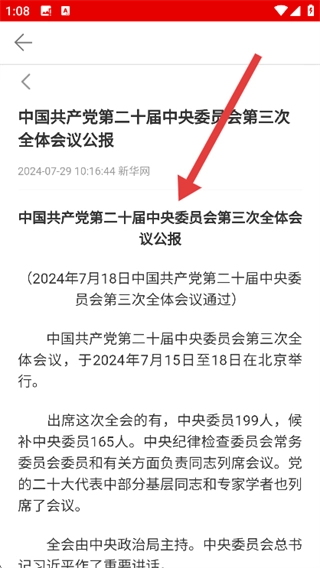 4、进入“中国共产党第二十届中央委员会第三次全体会议公报”页面,向下滑动屏幕即可浏览内容。
