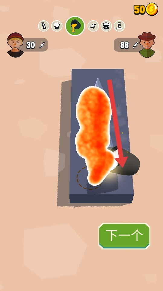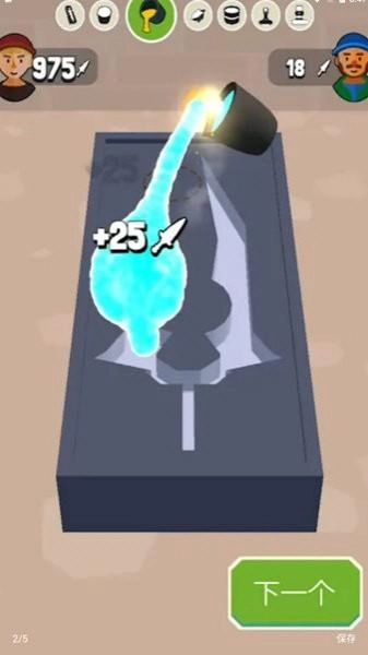 2、将熔炼后的金属放入锻打设备,按照提示上下滑动操作,对金属进行锻打塑形,逐步形成武器的雏形。