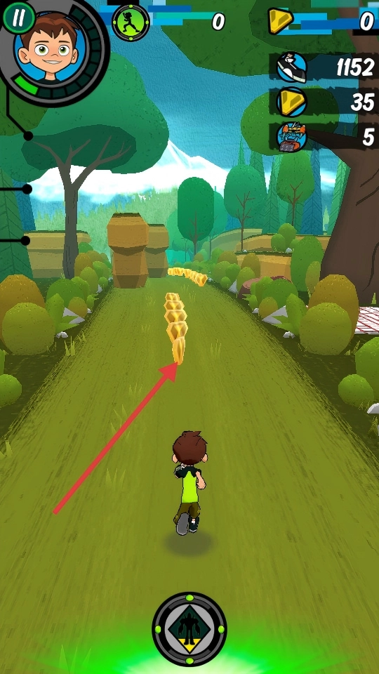 2、跑酷过程中,操控角色沿着道路移动,优先去收集道路金色硬币,同时留意左右两侧的树木、石块等场景元素。