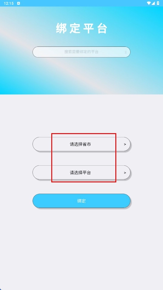 2、在绑定平台页面,选择【请选择省市】和【请选择平台】,输入平台名称后点击【绑定-功能按钮】。