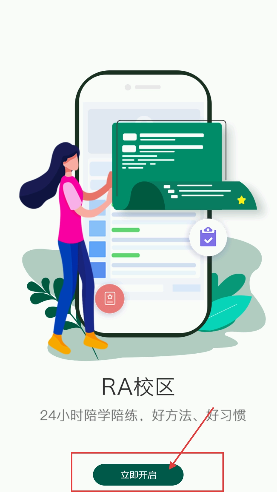 1、若想体验【RA校区】的24小时陪学陪练服务,点击【立即开启】按钮就能进入下一步操作。