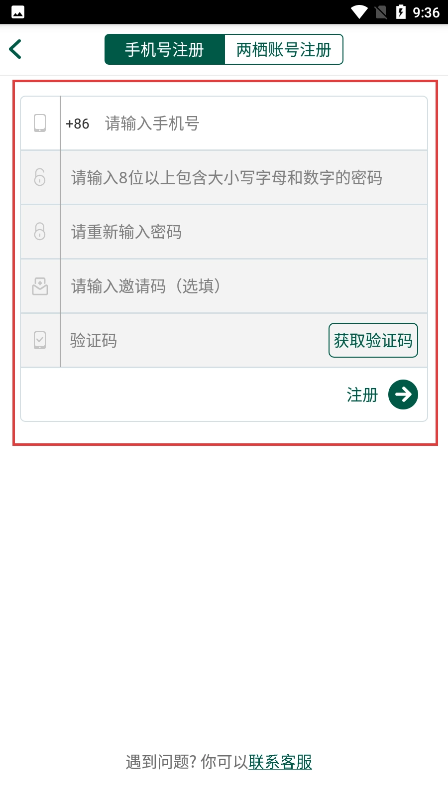 3、选择【手机号注册】时,依次输入手机号、符合要求的密码、等获取并输入验证码后,点击【注册】按钮即可完成手机号注册流程。