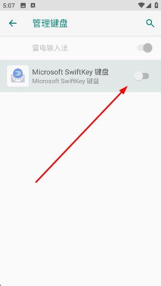 2、在管理键盘页面开启【MicrosoftSwiftKey键盘】的开关,启用该键盘。