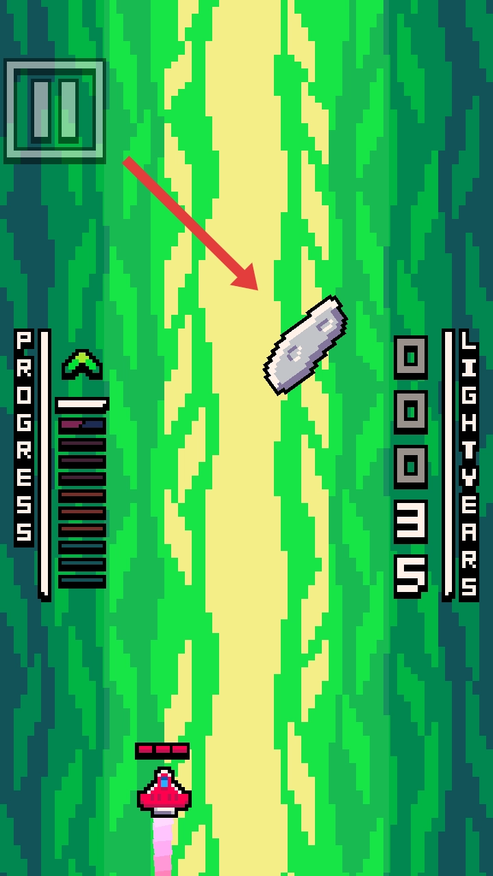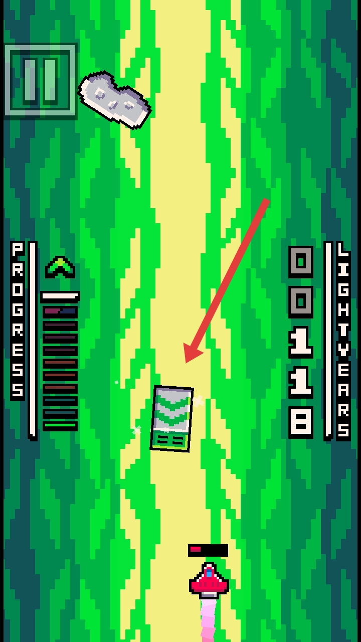 1、操控底部的红色战机,灵活避开场景里的障碍,像这个关卡中的灰色大石块,碰到时就得及时躲避。