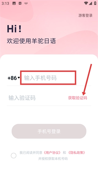 2、在登录界面,我们输入手机号码,然后点击【获取验证码】,准备验证登录呀。