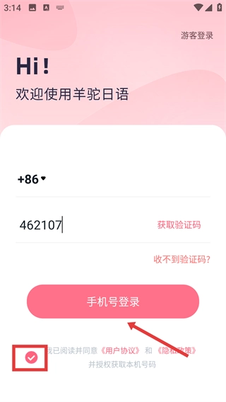 3、接着,我们在框中填写收到的验证码,同时勾选同意【用户协议】和【隐私政策】哦。