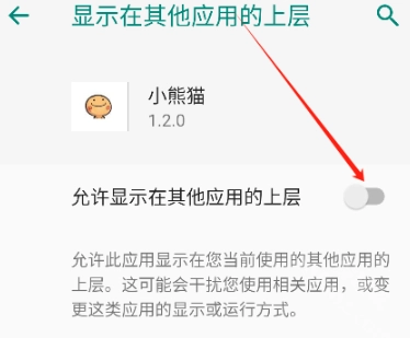 1. 打开手机中的小熊猫辅助器应用,点击“允许显示在其他应用上层”的按钮。
