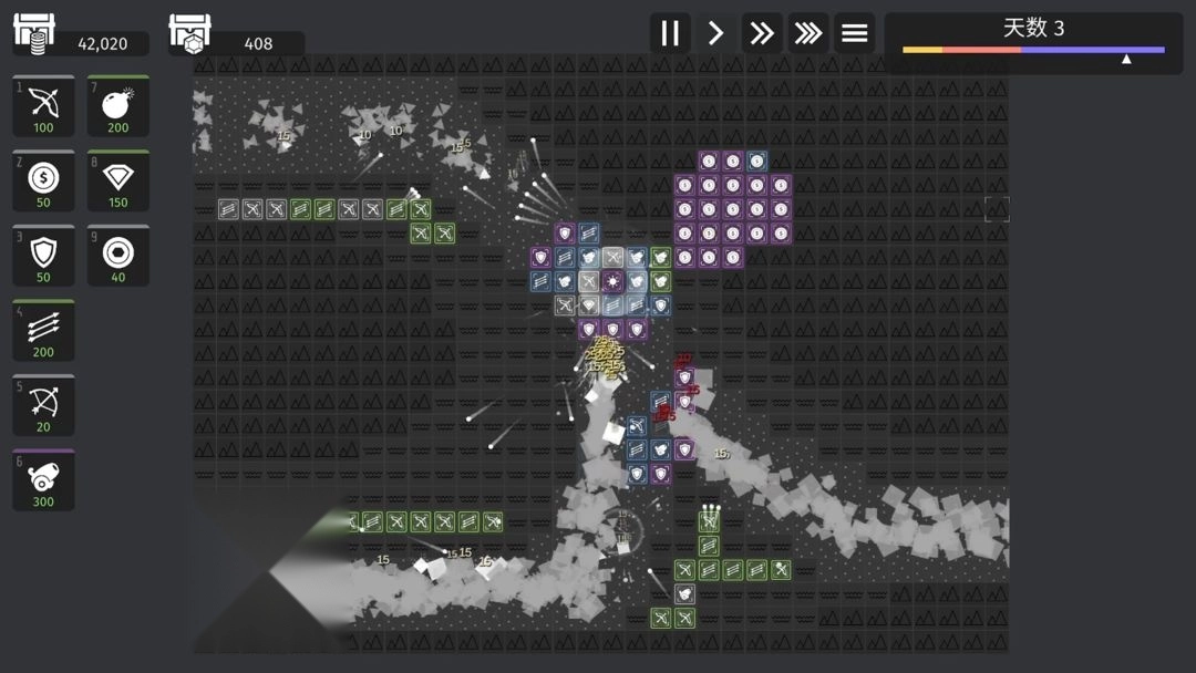 防御塔组合:主要使用盾牌和多重箭塔,炸弹仅用于紧急情况。