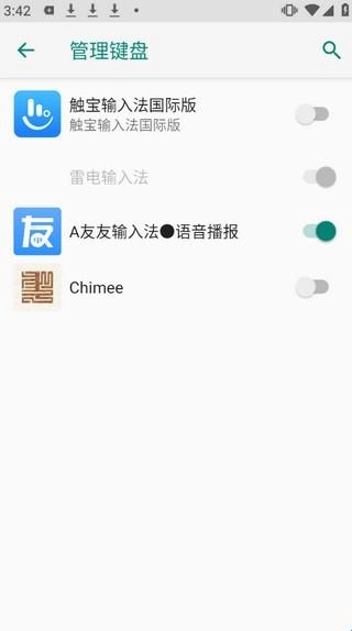 2、在管理键盘页面,开启触宝输入法右侧的开关。