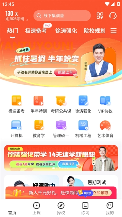 研途考研是研途教育旗下的在线辅导平台,专注于为考研学子提供一站式备考服务。平台汇聚了院校规划、考研政治、考研数学、考研英语、考研专业课及四六级通关等领域的优质在线直播课与精品录播课,并配备完善的配套学习资料,能够满足全日制考研、在职考研、艺术考研、MBA考研等不同群体的备考需求。此外,平台还为学生提供疑问解答、海量刷题题库、学习计划定制、考研资讯等全方位的考研规划与指导支持。