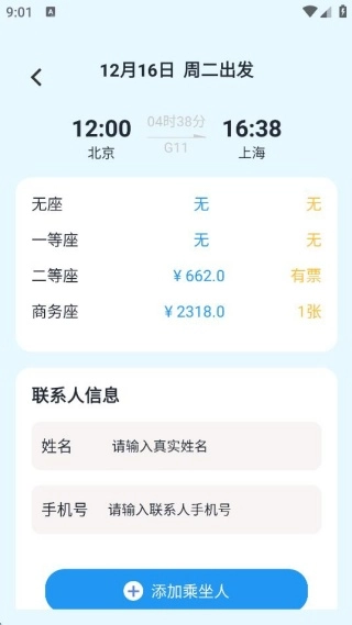 4、选择车次并填写乘车人信息,一键提交订单即可完成订票。