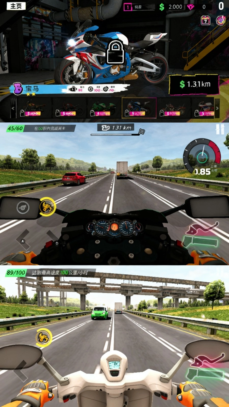 2、游戏内设置各类赛事任务,限定时间完成赛道,突破车流障碍,完成任务可获得丰厚奖励,助力摩托升级与赛道解锁。