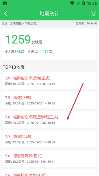 3、在地震统计页面,点击对应条目,进入该地震的详情展示页面。