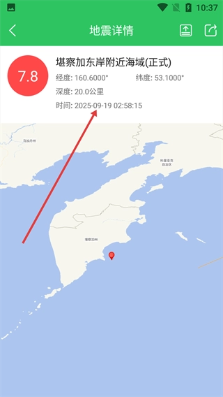 4、可查看该地震的【7.8-级】【经度:160.6000°】等信息及震中地图位置。