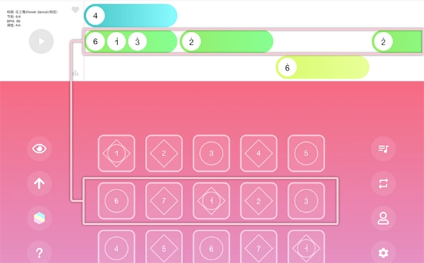 3、点击歌曲标题稍等片刻乐谱将加载到练习界面,乐谱分为三行,第一行对应键盘的第一行按钮。