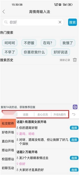 5、如下图所示,这就是输入法界面了,除了可以像常规输入法那样使用,还有各种开场语,话题可以便捷选择。
