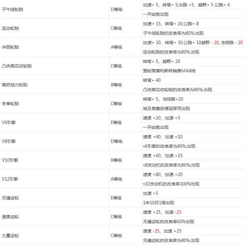 花纹轮胎和冰地轮胎:跑特殊赛道的配件,虽然特殊赛道出现的很少。但灵气多得没用处,就加在这两样吧。
