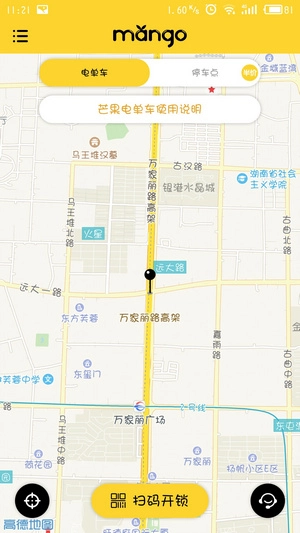 2.根据地图找到车辆,使用芒果电单车扫码解锁车辆