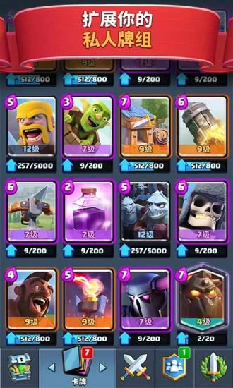 ●打造并升级您的卡牌收藏,包括《ClashRoyale》皇室成员和数十个来自于《部落冲突》的部队、法术和防御设施
