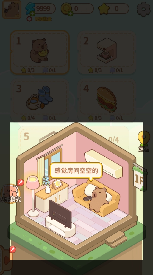 《千金筑梦物语》是一款主打收纳闯关的解压游戏,整体采用卡通画风,主角是广为人知的萌宠卡皮巴拉。玩家的任务是协助卡皮巴拉整理房间,解决房间里的脏乱问题,将各类物品按要求归置到指定位置,从而完成收纳挑战。在关卡开始前,建议先仔细观察房间内物品的分布与摆放情况,规划好收纳的先后顺序和路径,这样能更高效地完成任务。