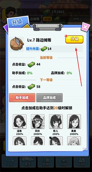 1、进入升级界面,消耗资源升级路边摊等级,提升点击收益,解锁助手加成功能。
