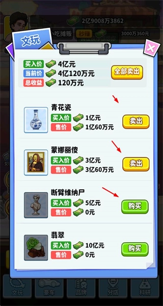 2、在文玩界面,通过买卖文玩商品赚取差价,积累资源以支持经营升级。