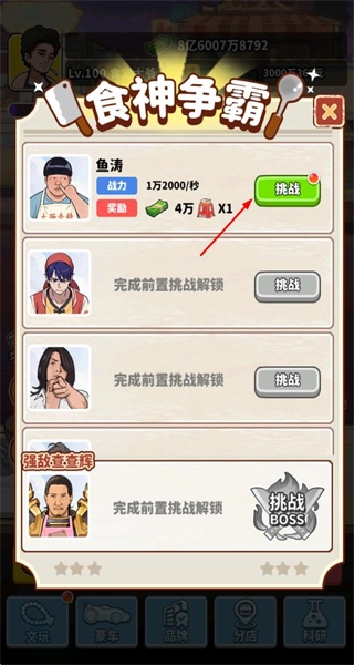 3、进入食神争霸界面,消耗资源挑战对手,获胜可获取奖励,推进对战进度。