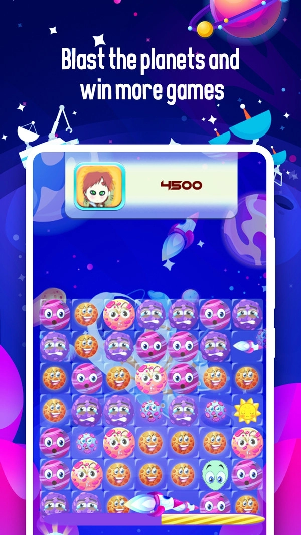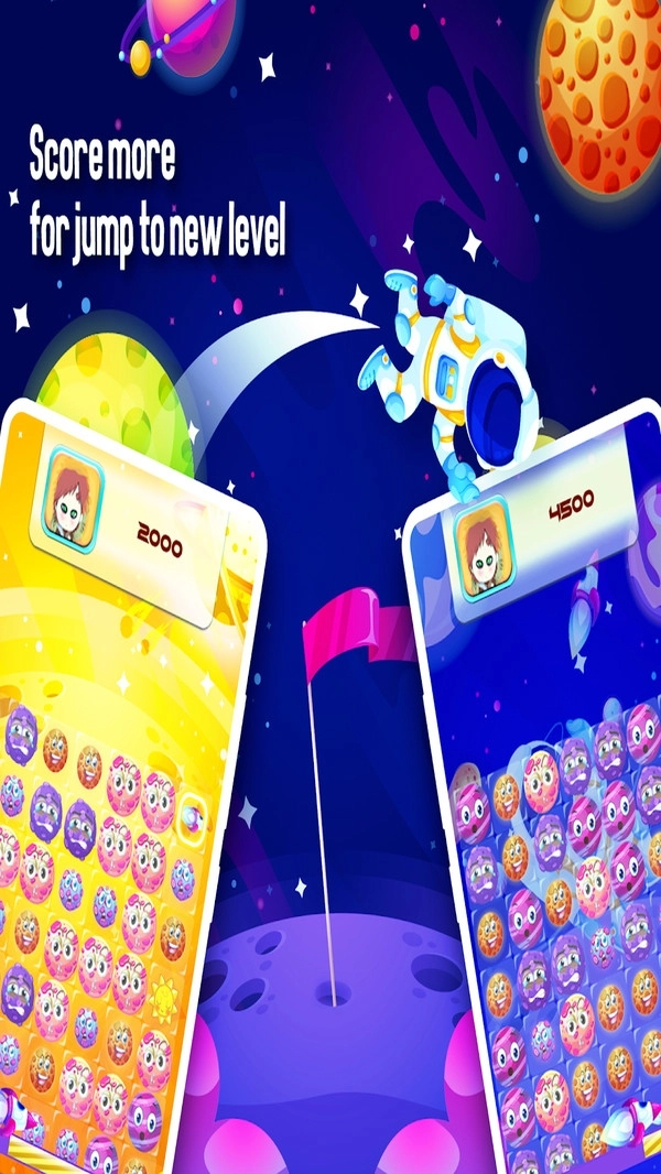 星球粉碎游戏是一款酷炫精彩的卡通太空闯关游戏,拥有轻松易上手的玩法。游戏采用十分简单的消除机制,玩家需快速点击来粉碎相同的星球,还有华丽精美的太空背景画面。