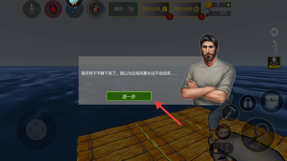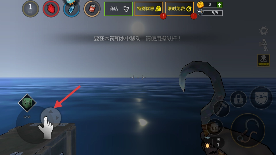 1、使用钩子打捞海上物资箱获取基础资源与食物维持生存。