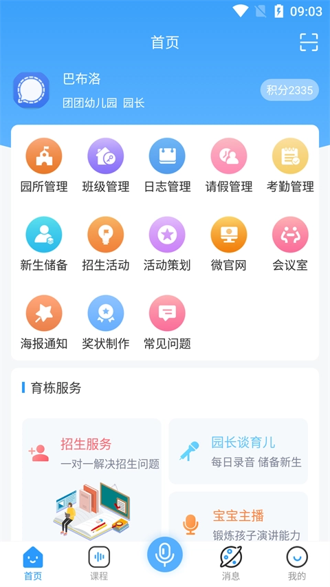 集成家园沟通、健康管理、教学资源共享、在线培训等功能,有效减轻日常事务负担,提升教学与管理效率。【园长端】