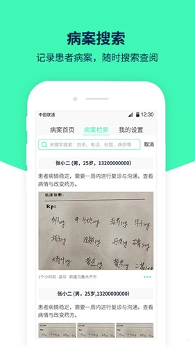:支持通过患者姓名、电话、病症等关键词,迅速定位并查阅历史病案,复诊时信息一目了然。3.