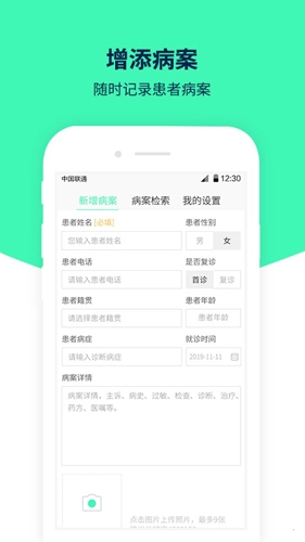 :患者首诊时可快速填写基本信息,支持一键录入病症与病案内容,并可通过拍照直接存档纸质病历,实现高效数字化管理。2.