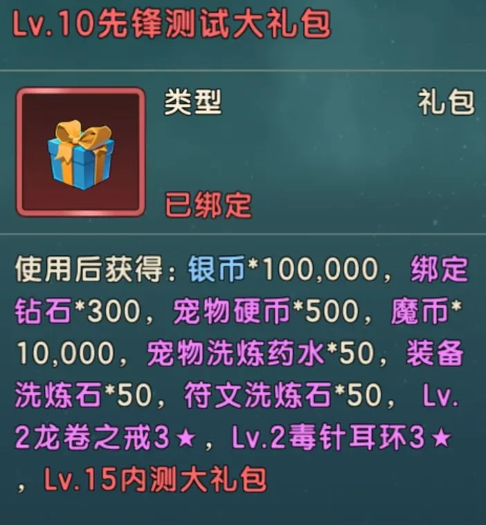 ④测试大礼包每隔5级都会有一轮大礼包,每次都会赠送大量奖励,推荐直接使用,能获取到一些比较紧要的资源和装备,节省角色培养所需时间。