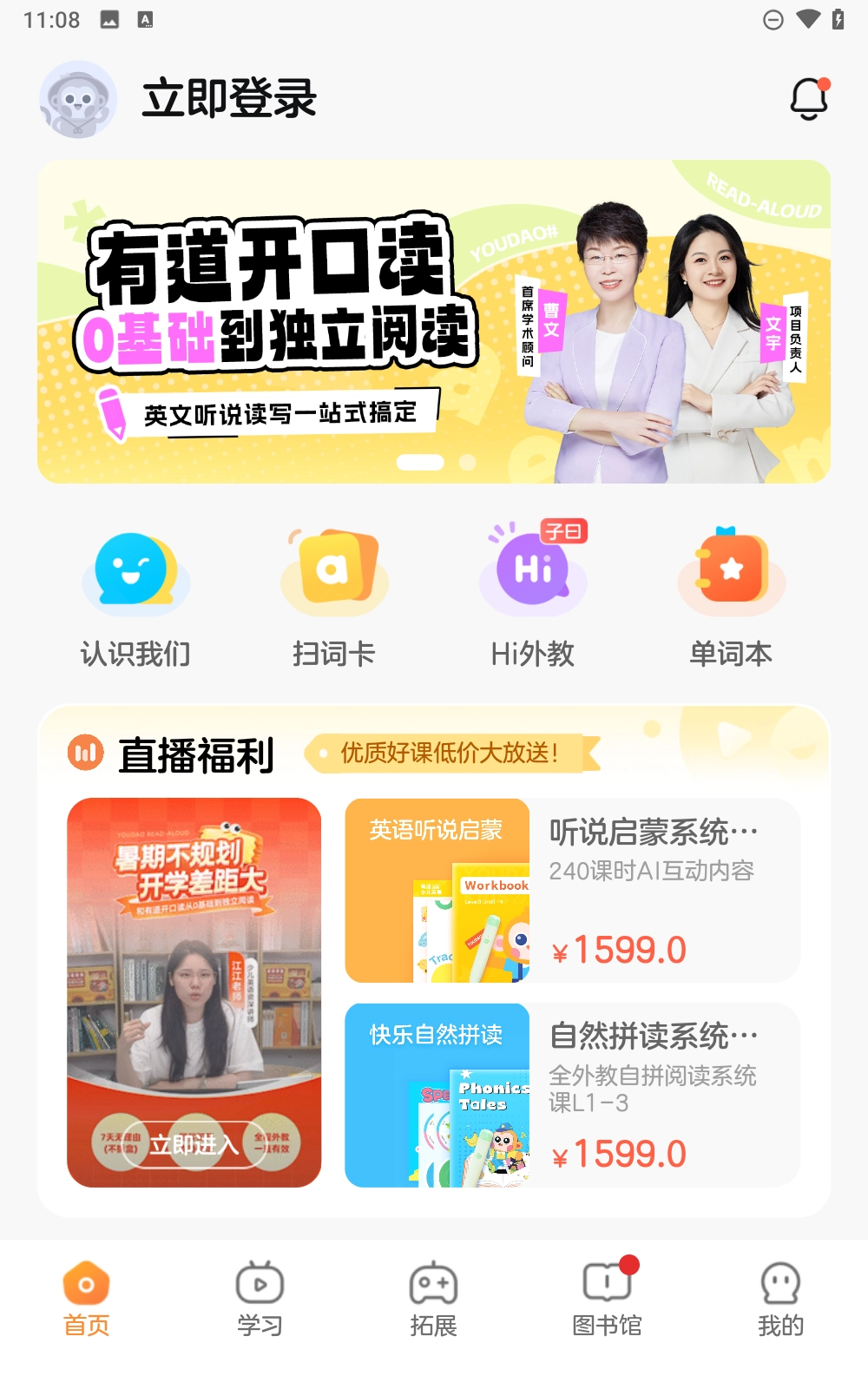 1、用户进入有道开口读后,可在【首页】使用各类功能。