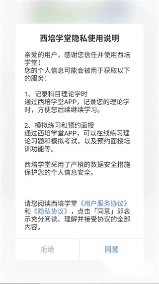 1、一键开启西培学堂,阅读隐私使用说明,点击同意。
