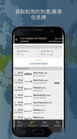 •点击机场图标查看到达和离开的时间表,航班状态,停飞的飞机,当前延误统计和天气状况