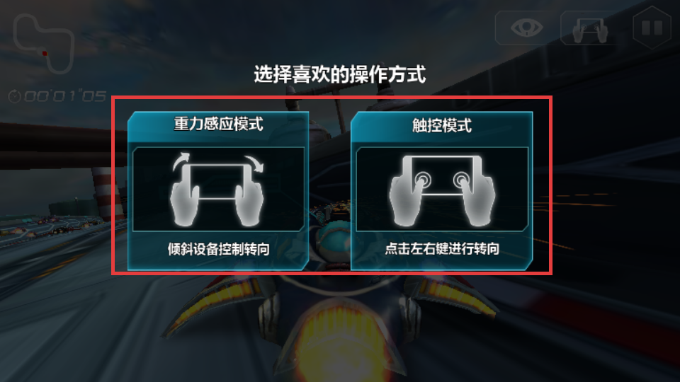 2、选择【重力感应模式】或【触控模式】,确定车辆操作方式。