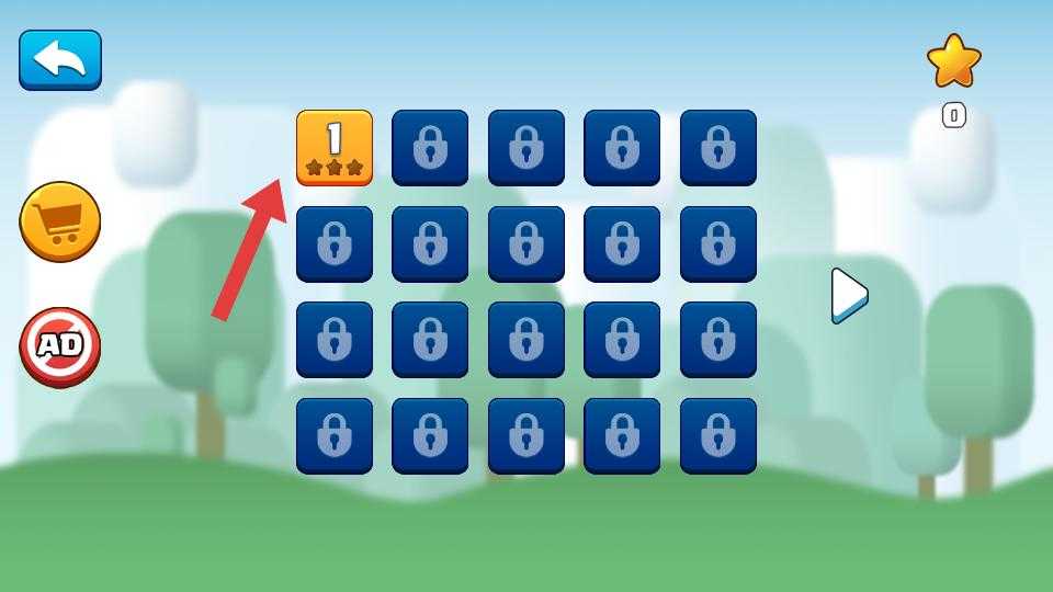 2、来到关卡选择界面,界面上有好些带锁的方块,其中仅有标着1的关卡能够进入,点击此关卡,即可开启第一关的挑战。