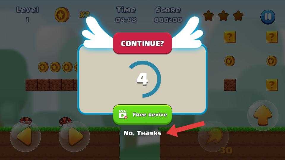 4、要是游戏中出现CONTINUE提示,既可以选择观看视频复活,也能够点击No,Thanks,重新开启或退出当下的挑战。