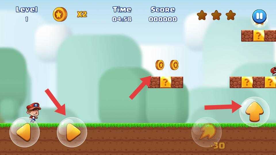 3、在关卡里操控角色进行移动,同时收集金币。当碰到问号方块时,会触发未知的内容。点击右侧的向上箭头按钮,角色就能实现跳跃动作。