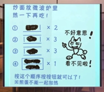 加热的时候我们需要查看一下线索了,线索虽然被盖住了一部分,但是每一步的涂鸦周围都有横竖的线,查看一下微波炉会发现这个线就对应操作面板的位置了,只有右边和下面有线的是左上角的切换功率,四周都有线的是中间的1分,只有右边没有线的是第二行右边的10秒,最后一个中间有线的是最下面的开始加热。
