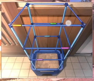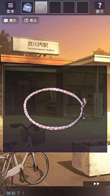 右走回到自己卧室,查看一下书桌对笔袋使用纸杯就能自动画好线并且剪开了,对纸杯使用线轴就能开始编织,这里再次佩服汉化组的谜题汉化,看起来都是些能组合起来的字呢,这个的线索比较远,出门骑自行车到车站,在原本有两个人的位置出现了一个牌子,查看一下获得线索星空小镇。